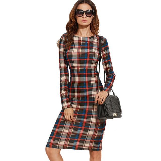 SHEIN Elegant Bodycon Dress Winter Autumn Dress Fall Women Multicolor Plaid Long Sleeve Knee Length Pencil Dress