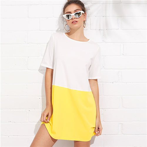 SHEIN Multicolor Weekend Casual White And Yellow Colorblock Two Tone Round Neck Short Sleeve Dress Summer Women Going Out Dress