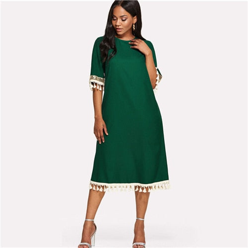 SHEIN Sequin And Tassel Detail Belted Dress 2018 Summer Round Neck Half Sleeve Knee Length Dress Women Green Casual Belted Dress