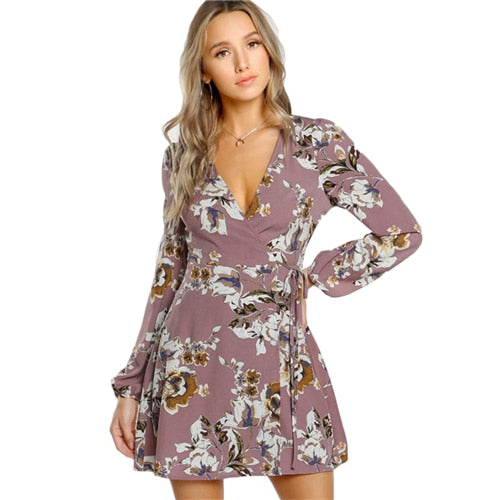 SHEIN Surplice Wrap Floral Dress Multicolor A Line Womens Dresses 2017 Autumn Style Deep V Neck Long Sleeve Dress