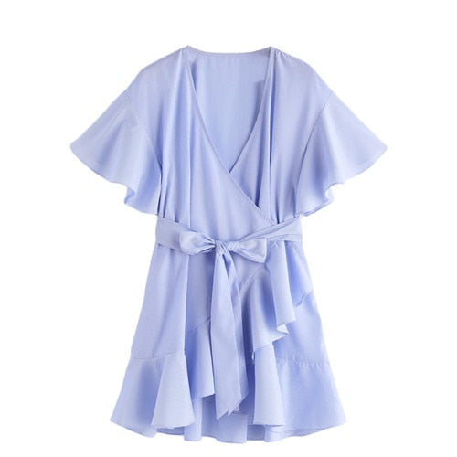 SHEIN Women Dress Summer 2017 Frill Detail Surplice Wrap Striped Dress Ladies Deep V Neck Short Sleeve A Line Dress